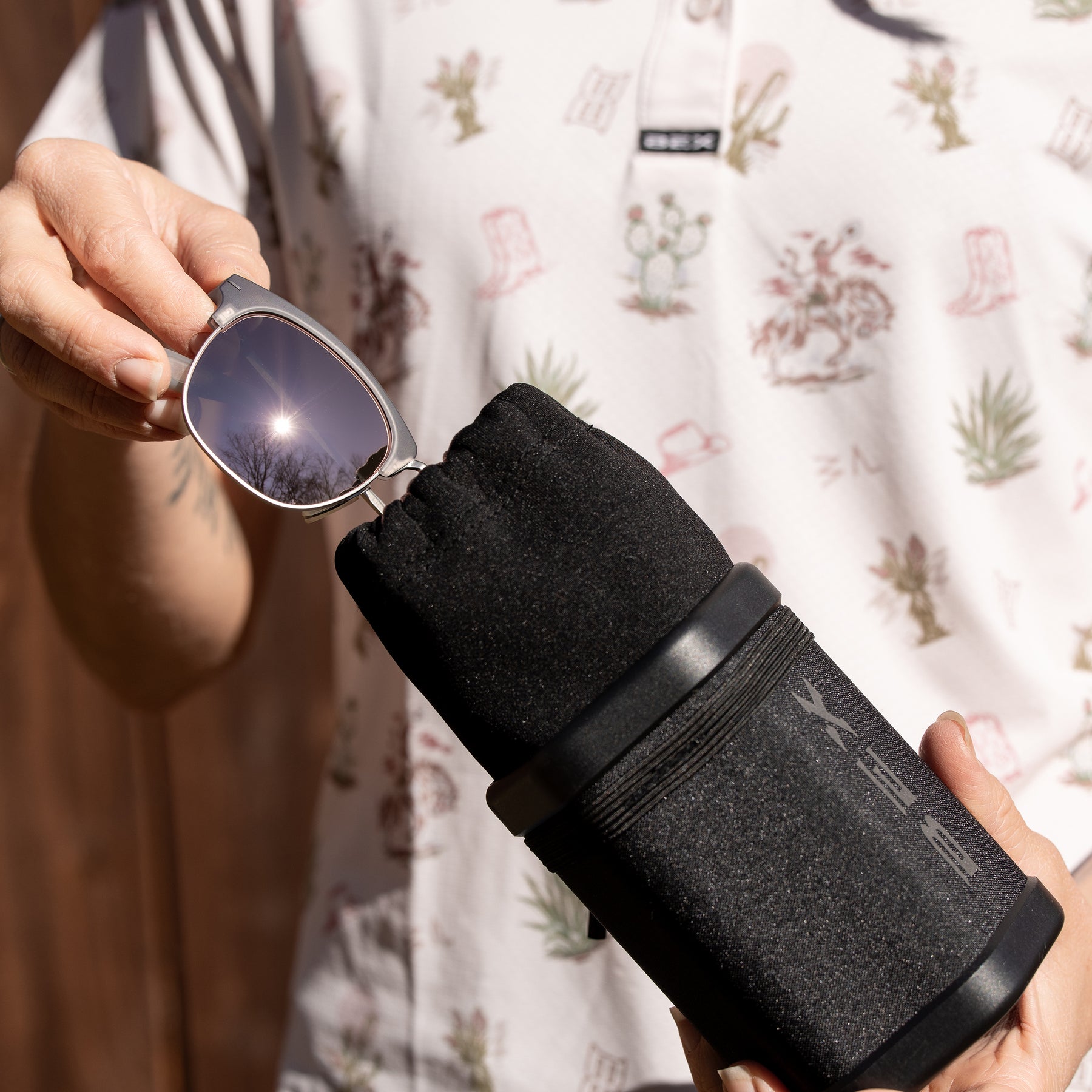 Wild Hearts sunglasses come with a Desert Aloha Dusty Rose microfiber pouch and the BEX® OTG Coozie Case, a dual purpose essential that protects your sunglasses and doubles as a drink cooler on the go.